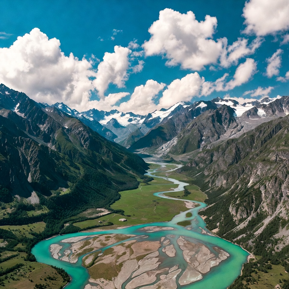 aerial view, alpine landscape, blue sky, braided river, emerald water, glacier river, green valley, high altitude, lush meadows, mountain range, nature scenery, outdoors, panorama, river bend, rugged peaks, snow peaks, snowy mountains, swiss alps, turquoise river, valley river, white clouds, winding river, mountain valley