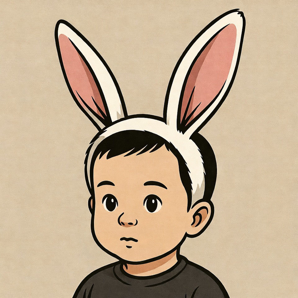 An illustration of a young Asian boy with short black hair wearing white bunny ears with pink insides on a beige background. He has large expressive eyes and a neutral expression on his face. He is dressed in a black t-shirt.