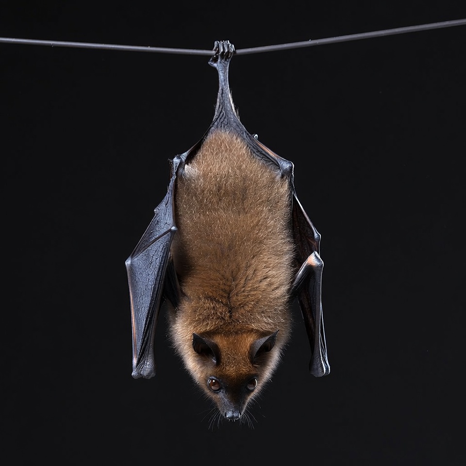 animal portrait, black background, brown bat, chiroptera, flying mammal, fur, hanging, hanging bat, isolated, mammal, nocturnal animal, upside down, wildlife, wings, wire, bat