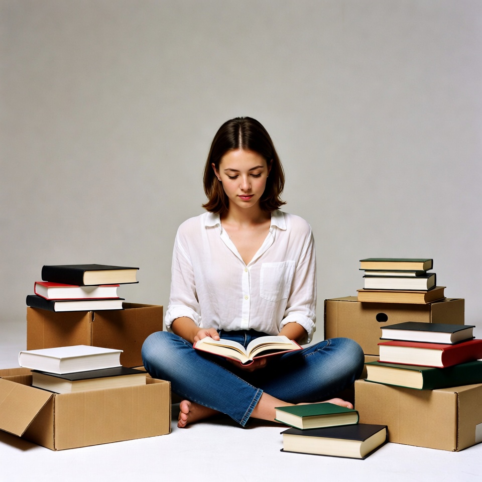 A young woman with shoulder-length brown hair sits cross-legged on the floor, reading an open book. She wears a white button-up shirt and blue jeans, with bare feet. Stacks of cardboard boxes and assorted books surround her on a plain gray background.