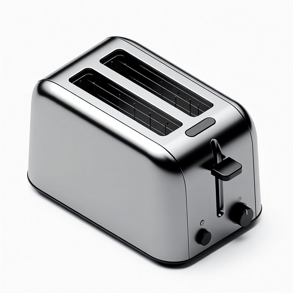 A modern silver toaster with two empty slots sits on a white background. It features black control knobs, a lever, and a sleek metallic finish. The appliance is angled to show its side and top views.