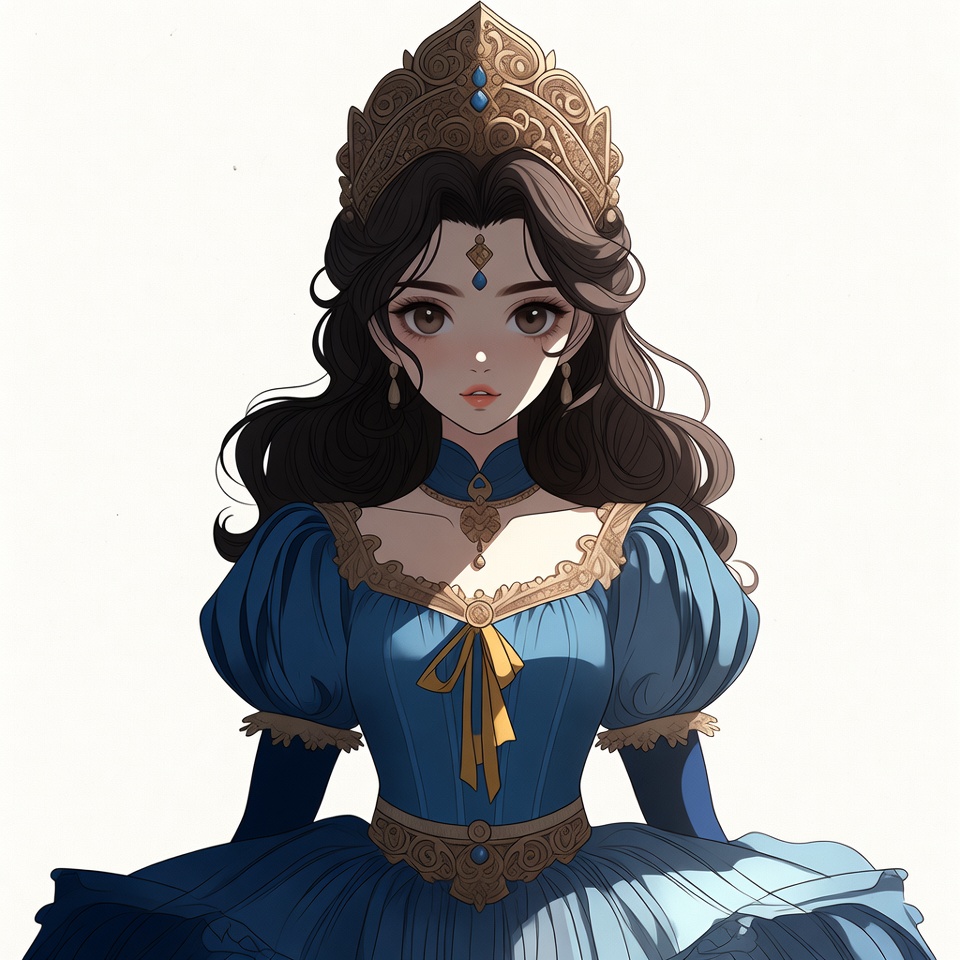 A beautiful anime girl with long wavy brown hair wears an elaborate golden crown with blue gems and a bindi on her forehead. She is dressed in a luxurious blue gown with gold embroidery, puffed sleeves, a yellow bow, and a wide skirt. The illustration features her against a white background with detailed facial features and jewelry.