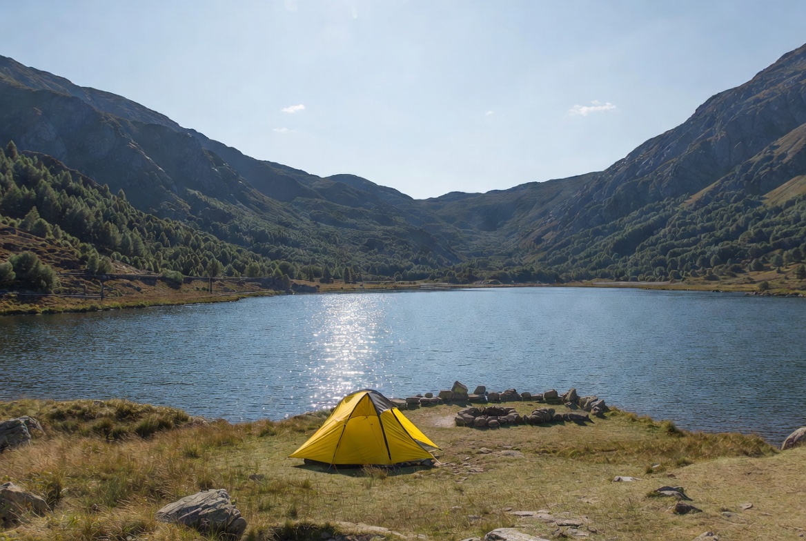A bright yellow tent is pitched on grassy terrain near a calm blue lake. Surrounding the tent is a stone campfire ring and scattered rocks. Majestic green mountains and forests frame the scenic valley under a clear blue sky.