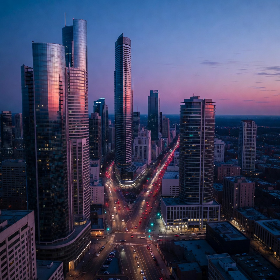 aerial view, architecture, cars, city lights, downtown, dusk, evening traffic, glass towers, high-rise buildings, highway, metropolis, modern buildings, road intersection, skyscrapers, sunset, taillights, traffic jam, twilight, urban landscape, city skyline