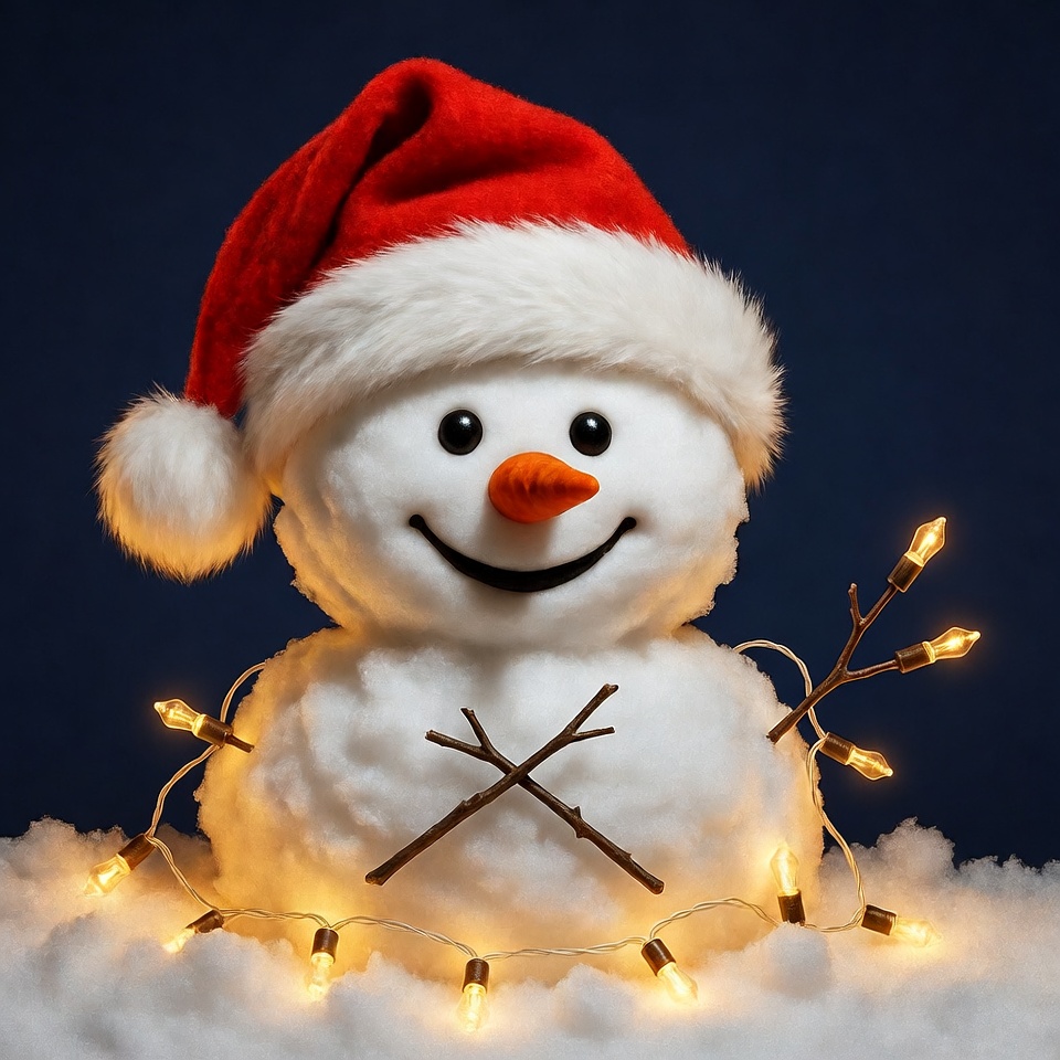 A cute snowman with a cheerful smile and carrot nose wears a red Santa hat with white trim. It has twig arms adorned with glowing Christmas lights and stands on a snowy base against a dark blue background. The snowman is constructed from fluffy white snowballs.