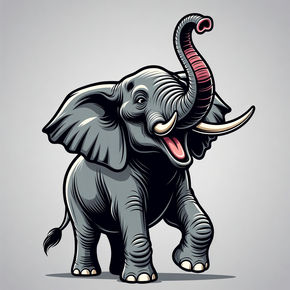 A vibrant vector illustration of a baby elephant trumpets with its pink trunk raised high. The elephant has large ears, tusks, and a wide open mouth showing its tongue. It stands on four legs against a plain gray background.