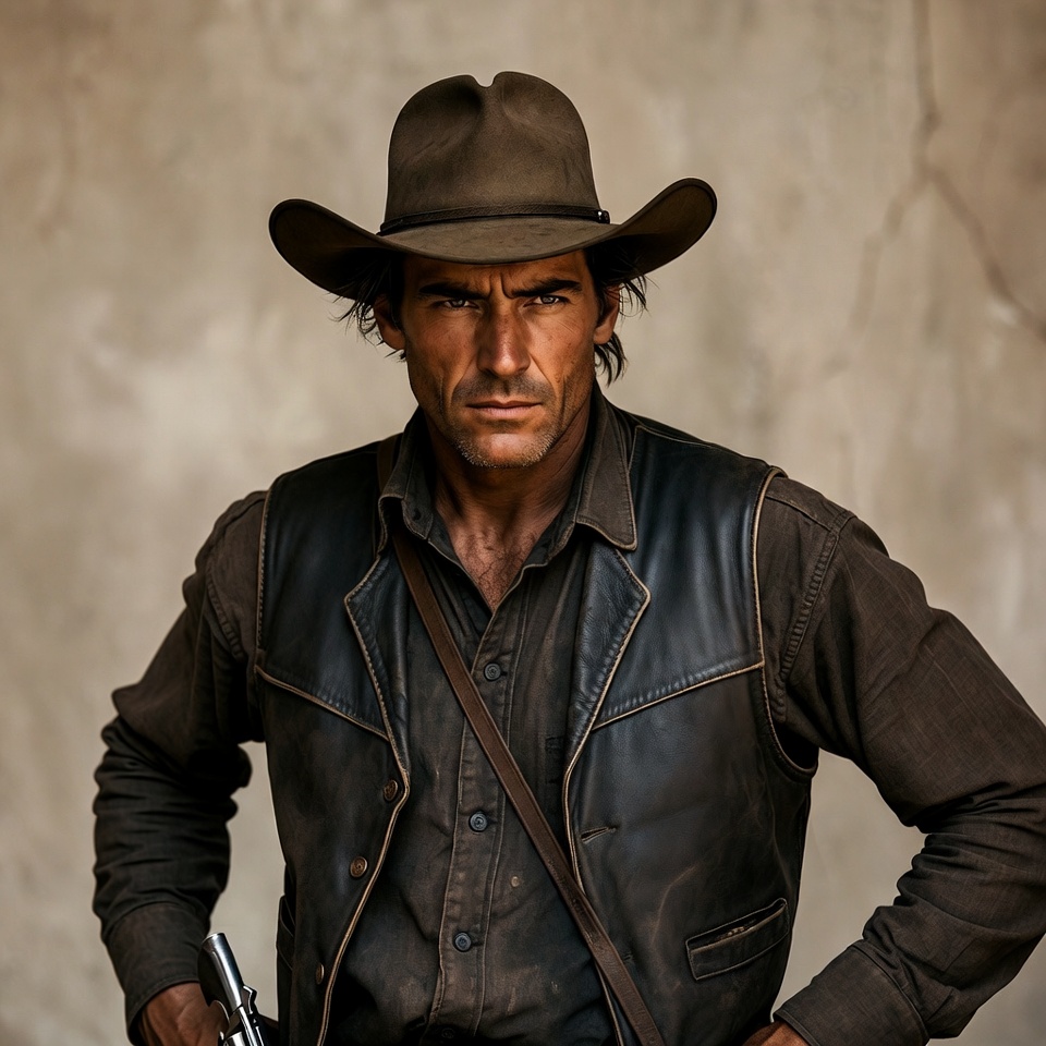 A rugged man with long dark hair and intense eyes wears a wide-brimmed brown cowboy hat. He is dressed in a brown leather vest over a shirt with suspenders and holds a revolver in his right hand. He stands against a textured beige wall with arms at his sides.