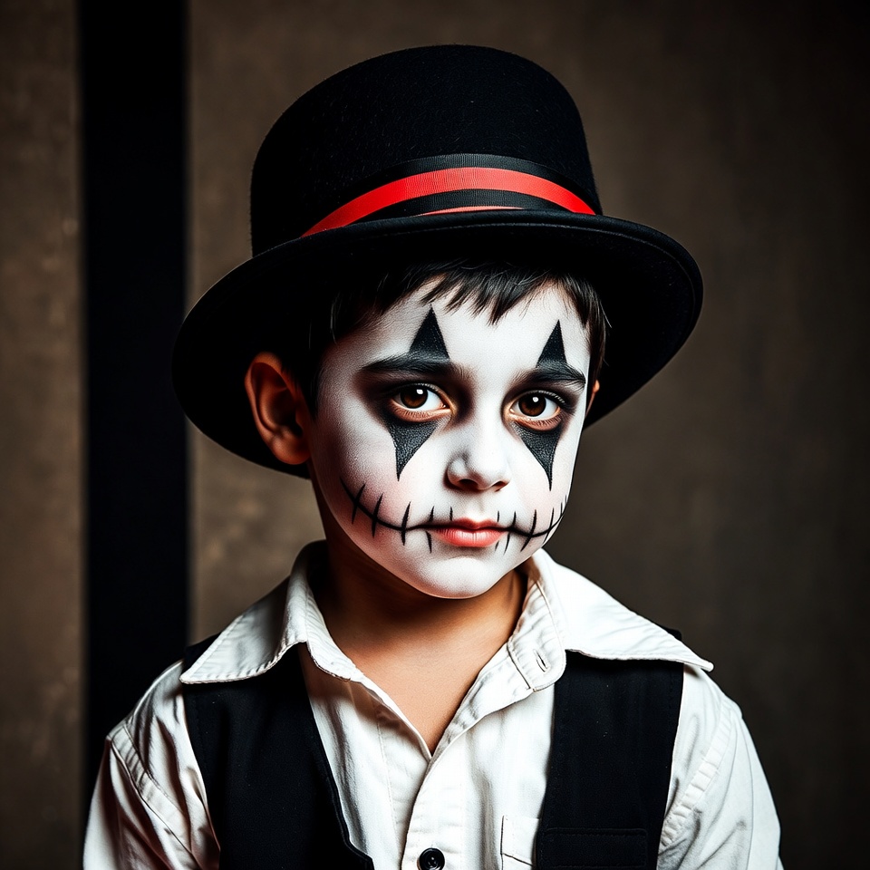 A young boy with dramatic black and white skeleton face paint stares at the camera. He wears a black top hat with a red band, a white collared shirt, and a black vest. The image features a dark, textured background.