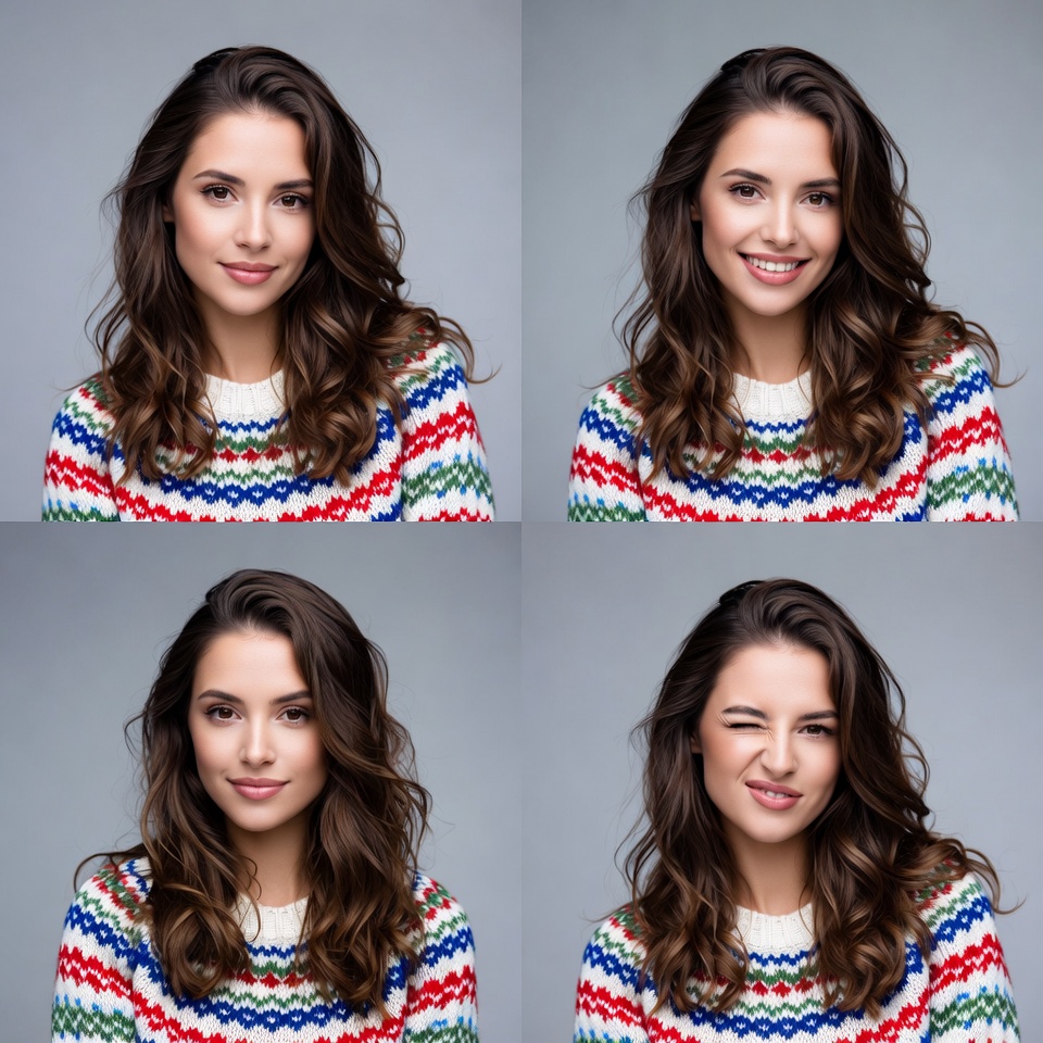 A young woman with long wavy brown hair wears a multicolored striped sweater in a four-panel portrait. She displays various expressions including a gentle smile, wide smile, and playful wink against a plain gray background. Her face is clearly visible in each close-up shot.