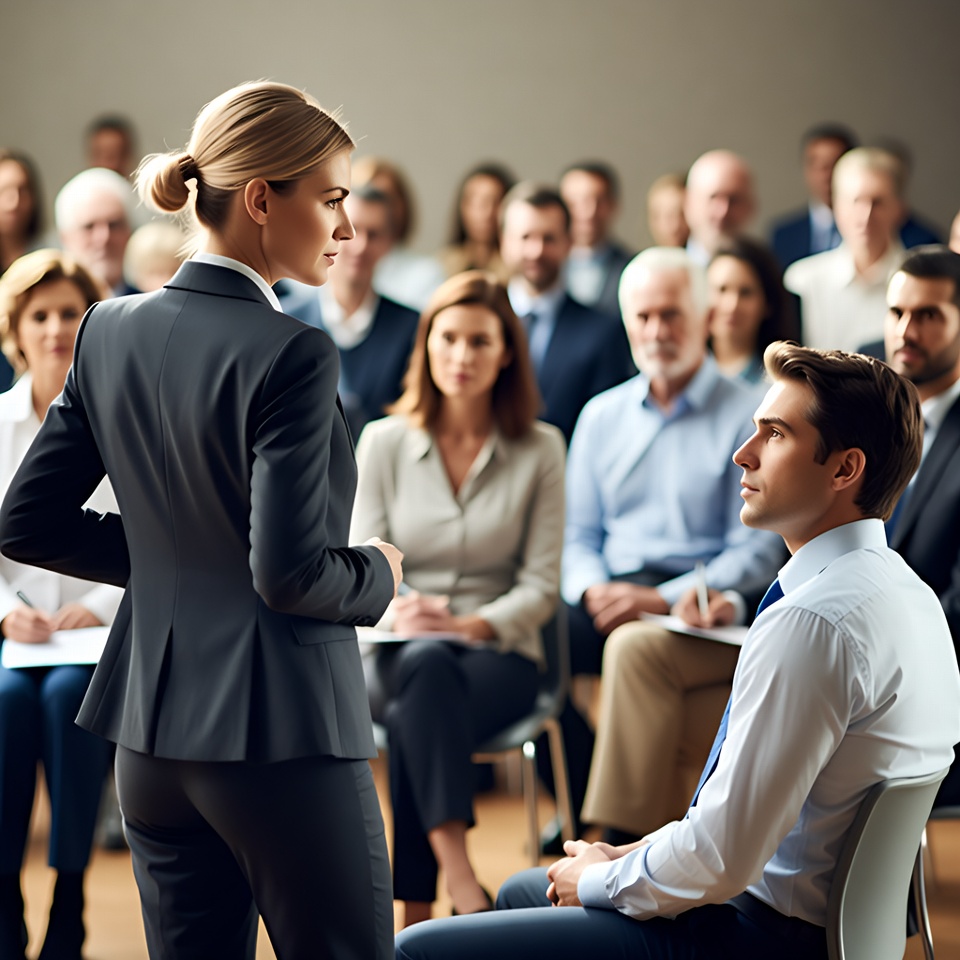 A blonde woman in a gray business suit stands at the front of a conference room, facing a diverse audience seated in chairs. She holds notes and gestures while presenting, with men and women in professional attire listening attentively. The audience includes various ages and ethnicities in a modern meeting setting.