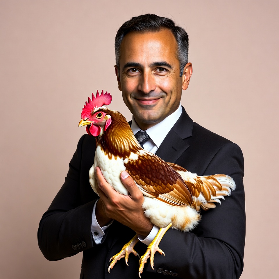 A Middle Eastern man in a black suit and tie smiles while holding a brown and white chicken. The chicken has a red comb and wattle, and yellow legs. They are posed against a plain beige background.