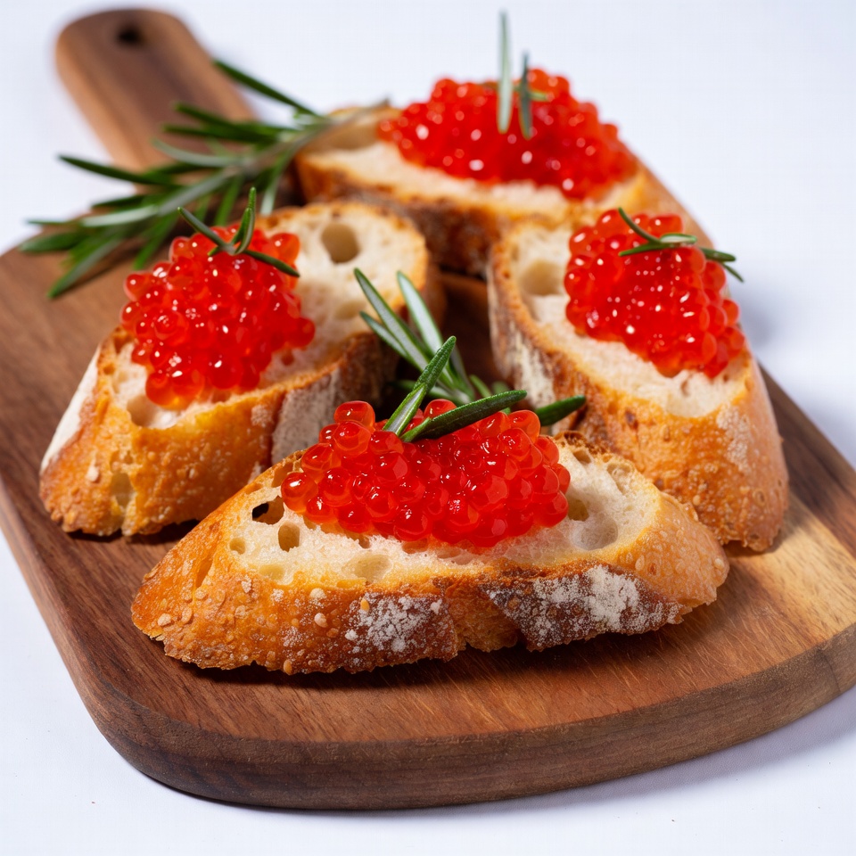 Four slices of crusty toasted bread topped with vibrant red caviar are arranged on a wooden cutting board. Fresh green rosemary sprigs garnish each piece, adding contrast and freshness. The setup is isolated against a white background.