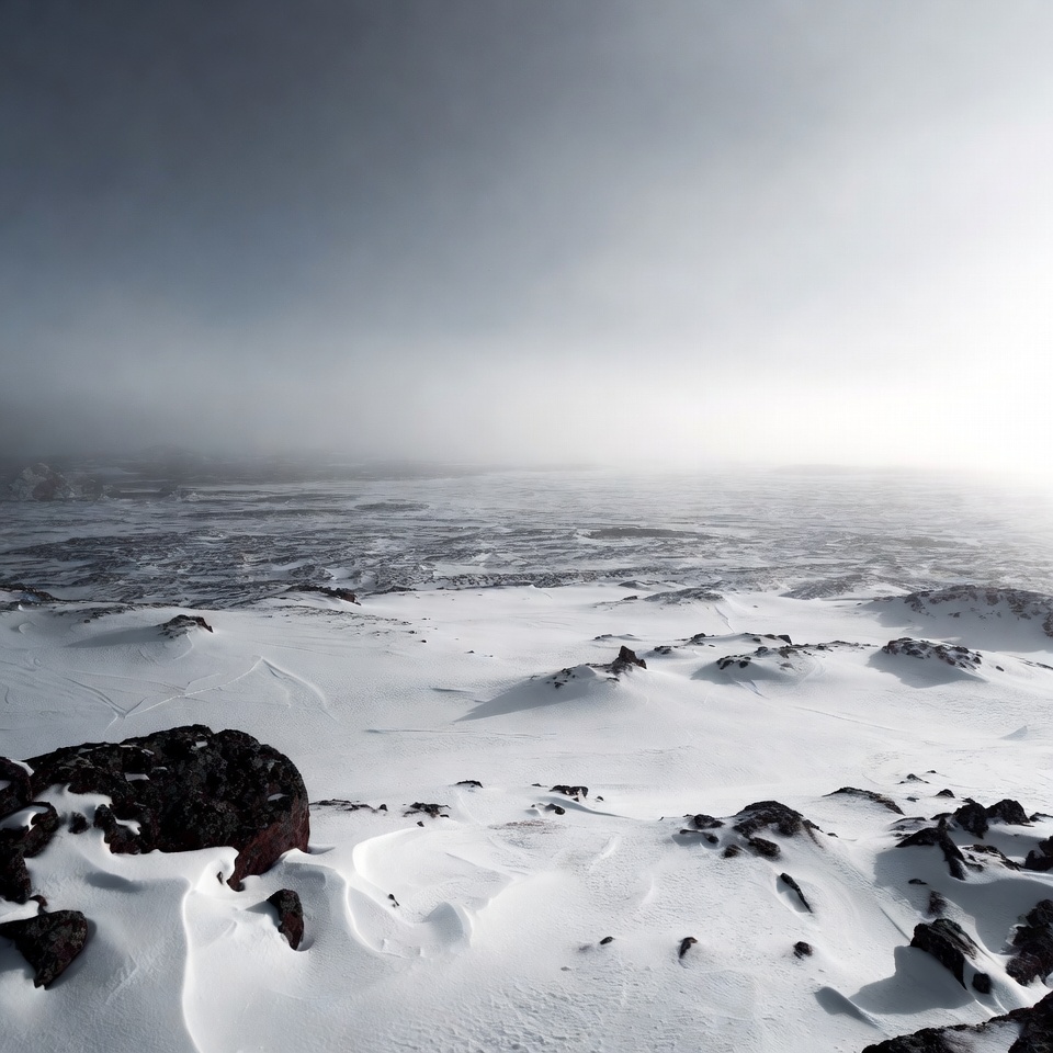 arctic, cold, dark rocks, dunes, fog, frozen terrain, gray sky, horizon, ice, misty sky, nature, outdoor, rocks, snow, snow drifts, sunlight, tundra, wilderness, winter, snowy landscape