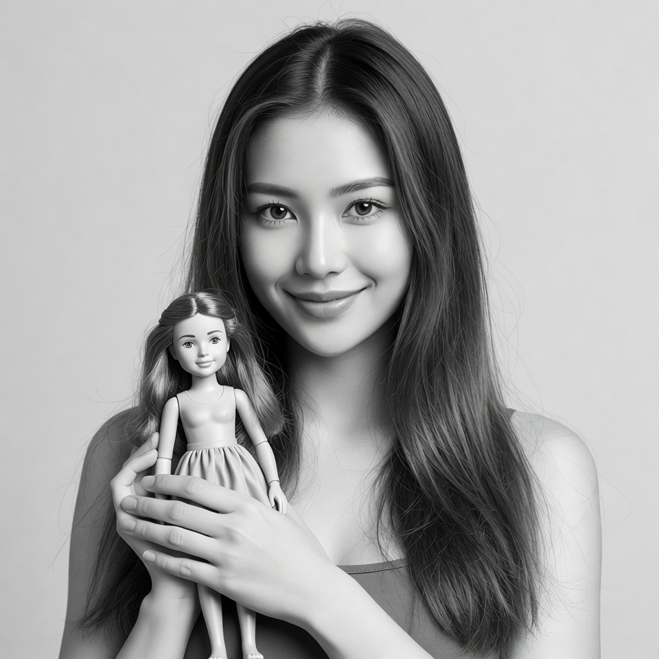Asian, black and white, black hair, blonde doll, doll, dress, female, hands holding, holding doll, isolated background, long hair, monochrome, portrait, sleeveless top, smiling, straight hair, toy, young woman, woman