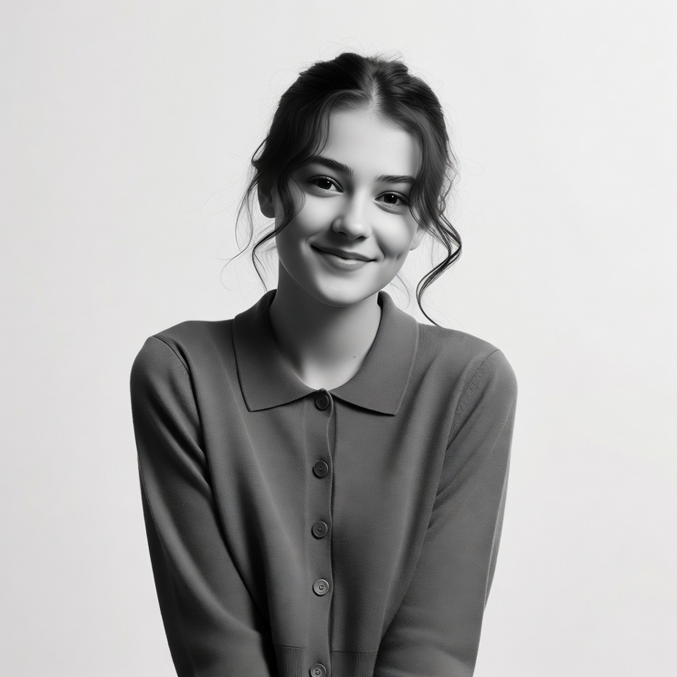 A young woman with dark wavy hair tied in a loose bun smiles warmly at the camera. She wears a collared sweater with buttons down the front and stands against a plain white background. The black-and-white portrait highlights her gentle expression and soft features.
