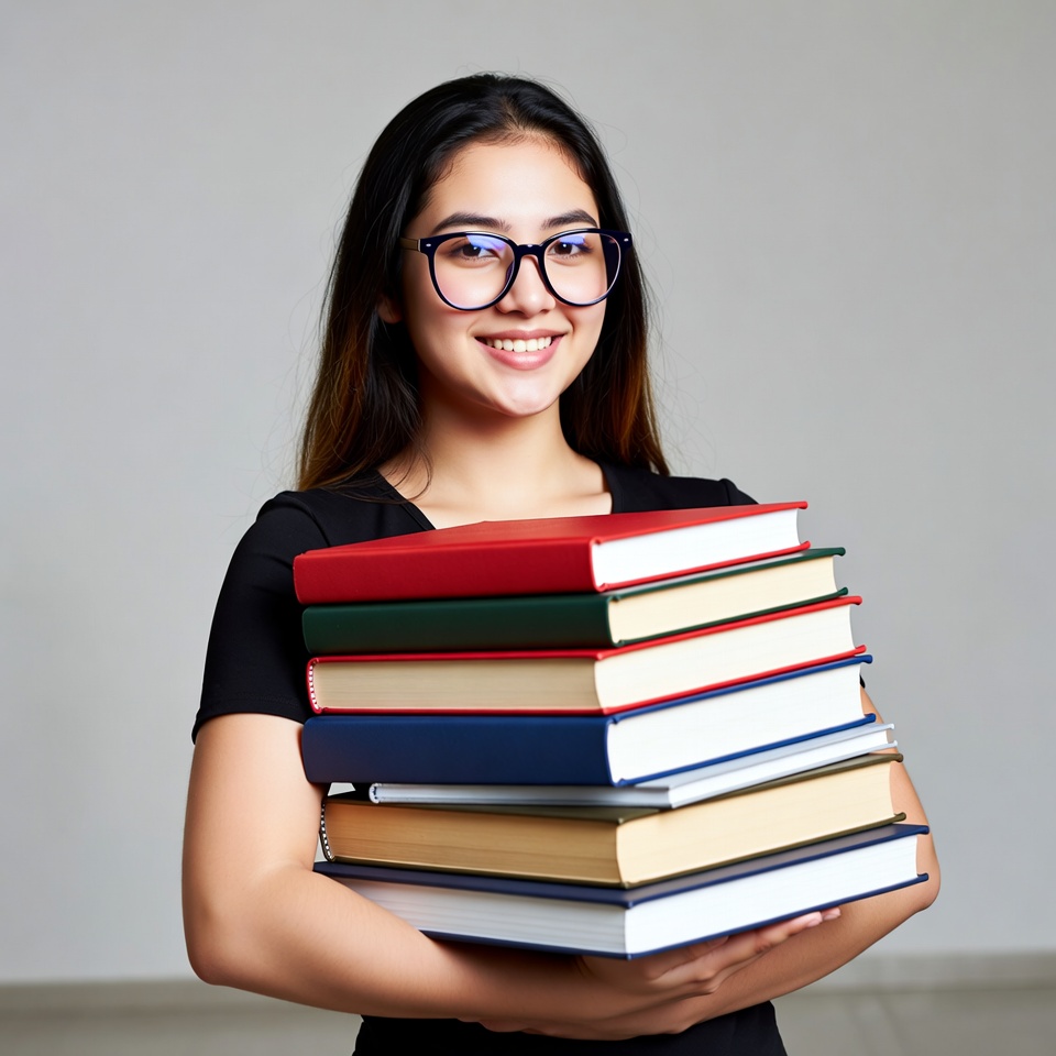 A young Asian woman with long dark hair and blue glasses smiles while holding a tall stack of colorful books in her arms. She wears a black top and stands against a plain white background. The books include red, green, blue, and white covers in various sizes.