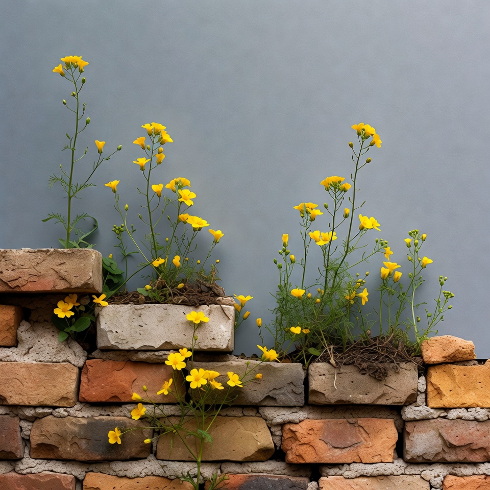 brick wall, bricks, brown bricks, flower clusters, flowers, gray background, gray bricks, green stems, plant growth, red bricks, small flowers, urban nature, wall, wall plants, yellow blooms, yellow flowers