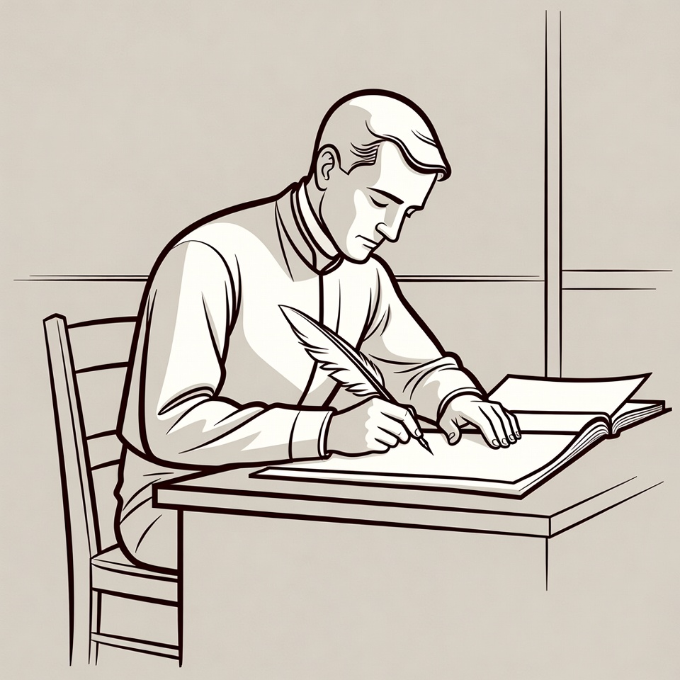 A line drawing illustration depicts a man in a collared shirt sitting at a desk, writing on an open book with a feather quill pen. He is seated on a wooden chair in a simple room with a window. The black and white sketch emphasizes his focused posture and historical attire.