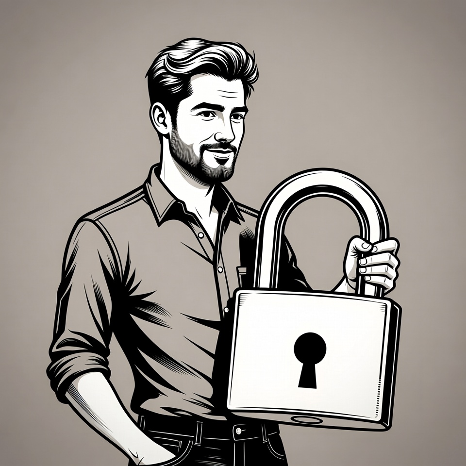 A line art illustration depicts a young man with short hair and a beard standing confidently while holding a large padlock in his right hand. He wears a button-up shirt with rolled sleeves and slim jeans, with his left hand in his pocket. The image features a simple beige background, emphasizing the bold black outlines and white highlights.