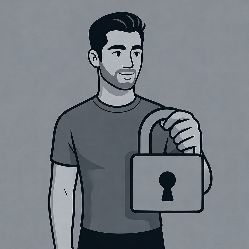 A black and white line art illustration depicts a young man with short hair and a beard wearing a t-shirt. He stands confidently holding up a large padlock in his right hand against a plain gray background. The style is minimalist vector graphic with clean outlines.
