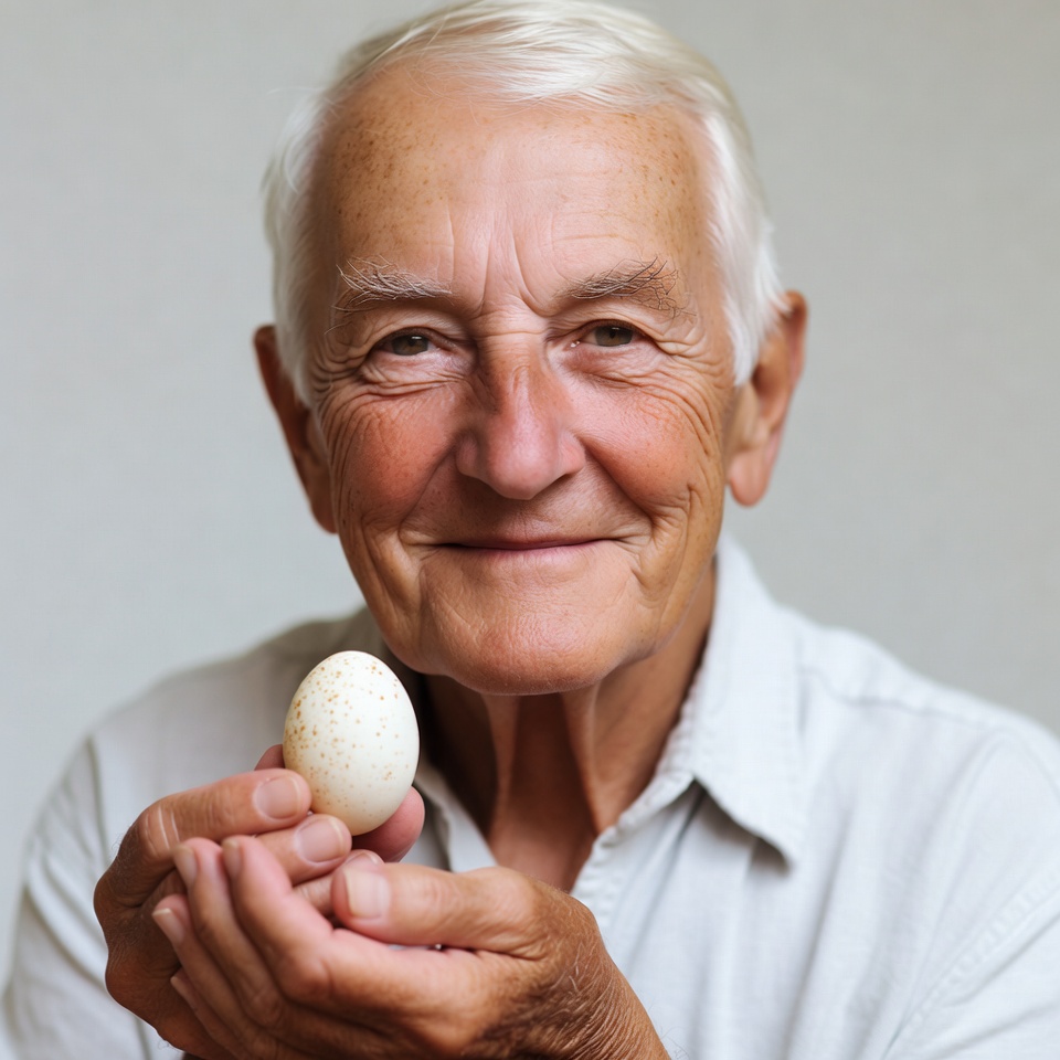 An elderly White man with white hair and wrinkled skin smiles warmly while holding a small speckled egg in his hands. He wears a light gray collared shirt and stands against a plain white background. His eyes are crinkled in a gentle expression as he gazes at the egg.