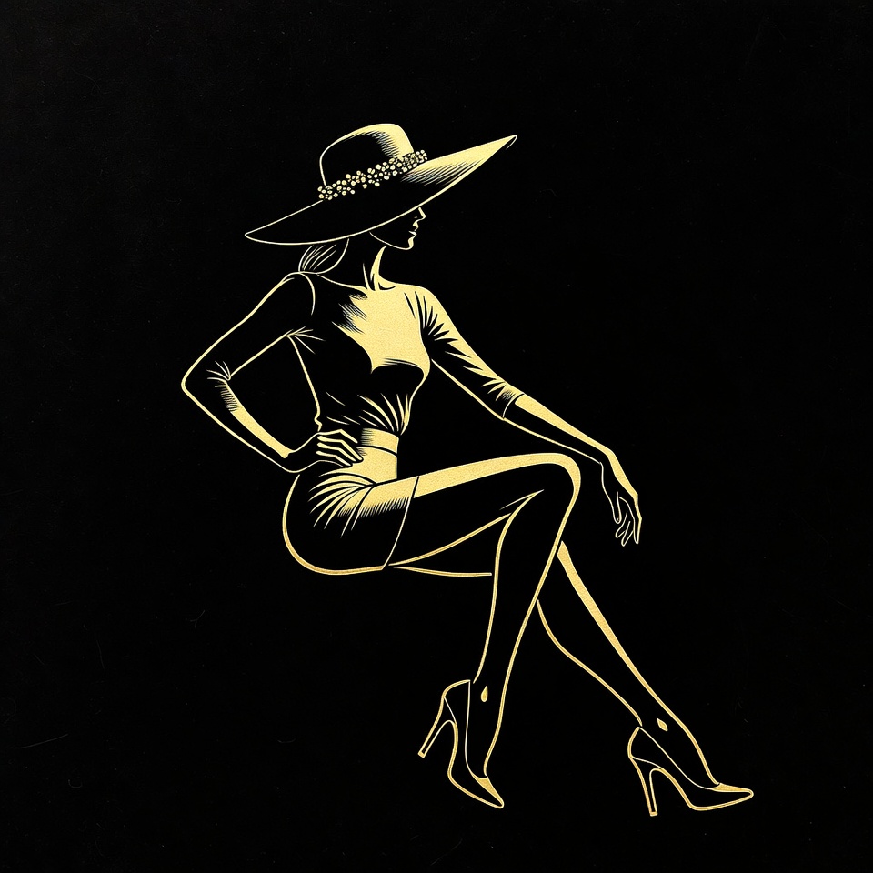 A golden silhouette illustration of a stylish woman sitting with legs crossed on a black background. She wears a large wide-brim hat adorned with flowers, a fitted dress, and high heels. Her pose is elegant with one hand on her hip.