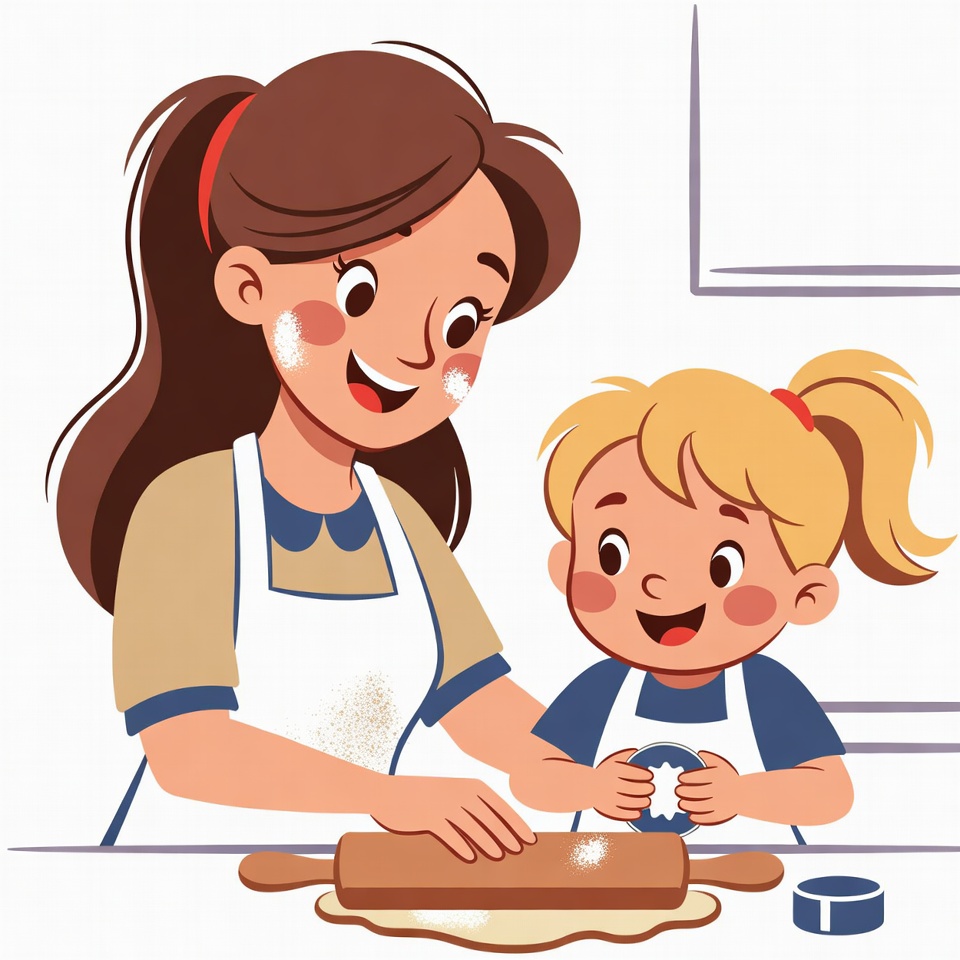 A cheerful mother with brown hair in a beige apron and a little girl with blonde pigtails in a blue apron roll dough together on a kitchen counter. Flour dusts their aprons and hands as they use wooden rolling pins and cookie cutters. The colorful illustration shows them smiling happily in a bright kitchen setting.