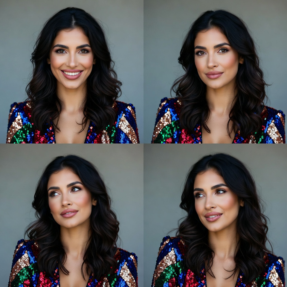 Middle Eastern, beauty, close-up, colorful sequins, dark hair, female, four poses, glamorous, gray background, headshot, long hair, makeup, portrait, pout, sequin dress, smiling woman, wavy hair, woman