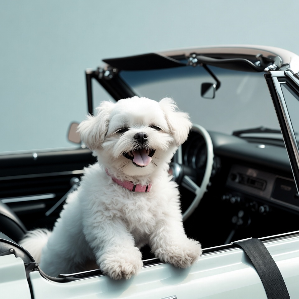 A fluffy white Shih Tzu puppy with a pink collar sits happily in the driver's seat of an open-top convertible car. The dog smiles with its tongue out, paws on the door, against a light blue background. The car's black interior and chrome details are visible.