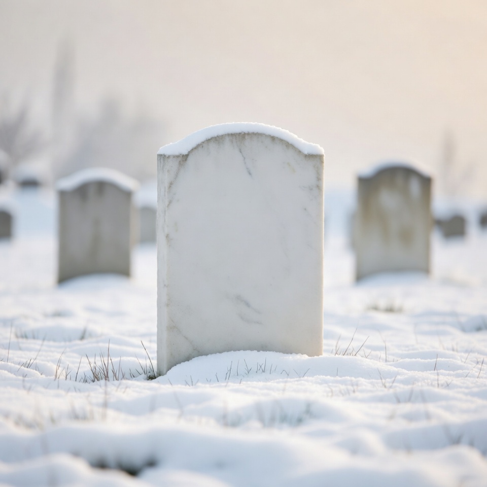A row of white marble gravestones stands in a snowy cemetery during winter. The central gravestone is blank and covered with a light layer of snow on top. Bare trees and a foggy background are visible under soft sunlight.