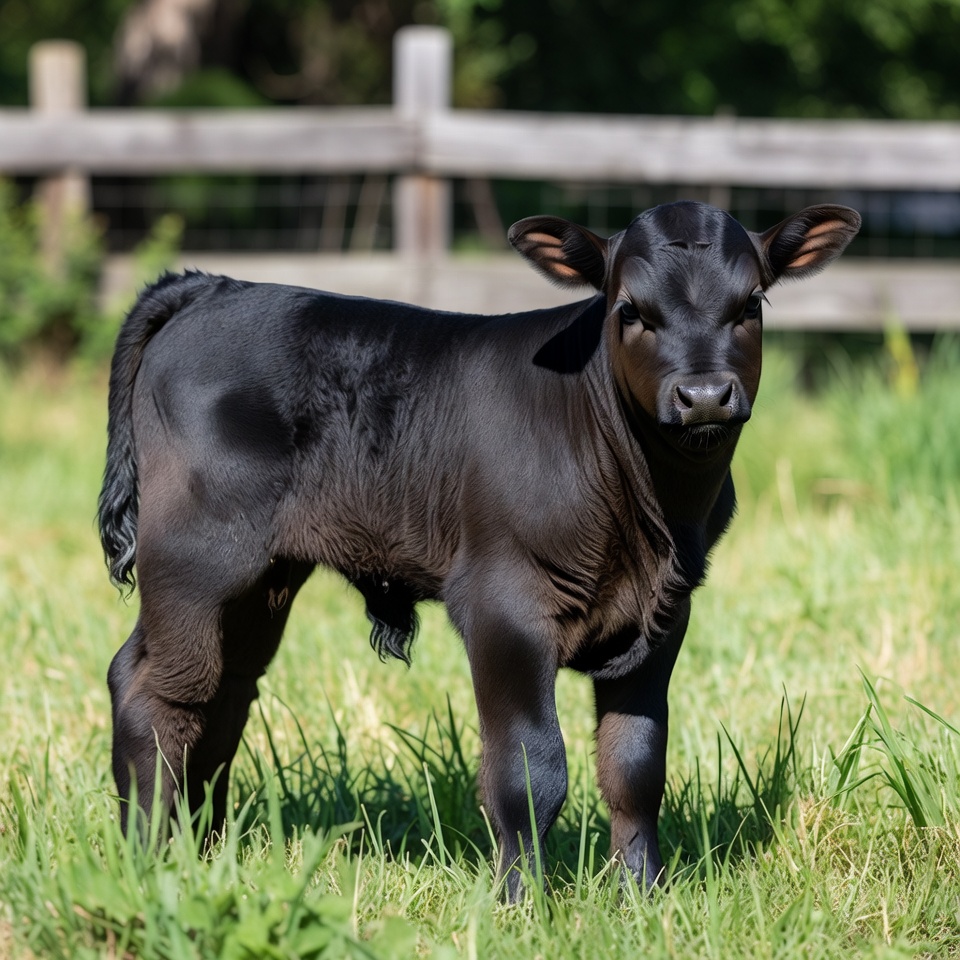 A young black calf stands on green grass near a wooden fence. It has shiny black fur, large ears, and a curious expression. Lush green trees and pasture surround the scene.