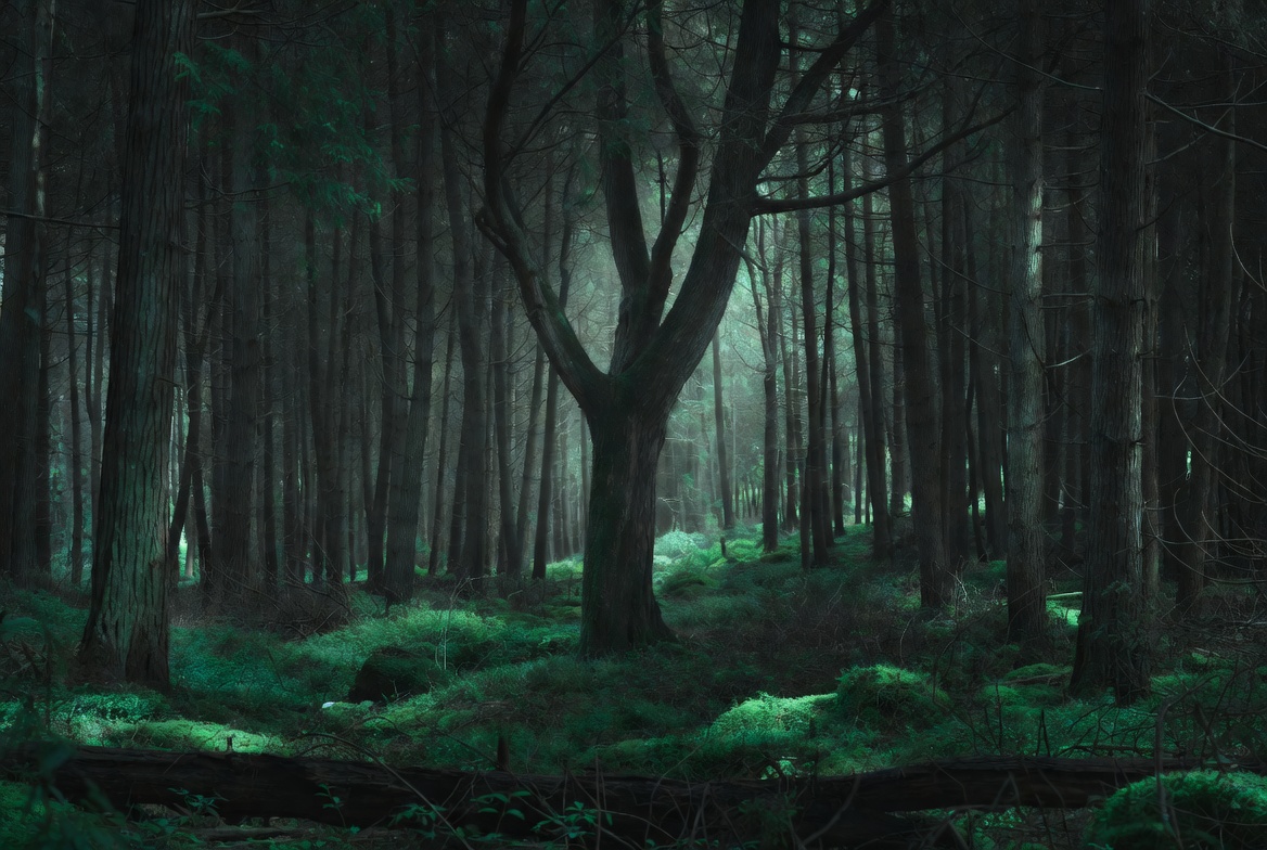 atmospheric fog, dark woods, dense forest, eerie woods, evergreen trees, fog, foggy trees, foggy woods, forest interior, forest path, green foliage, green moss, mist, misty atmosphere, moss covered ground, mossy ground, mysterious woods, natural scenery, nature landscape, pine forest, pine trees, shadowy trees, spooky forest, tall trees, tree trunks, twisted tree, woodland fog, woodland scene, dark forest