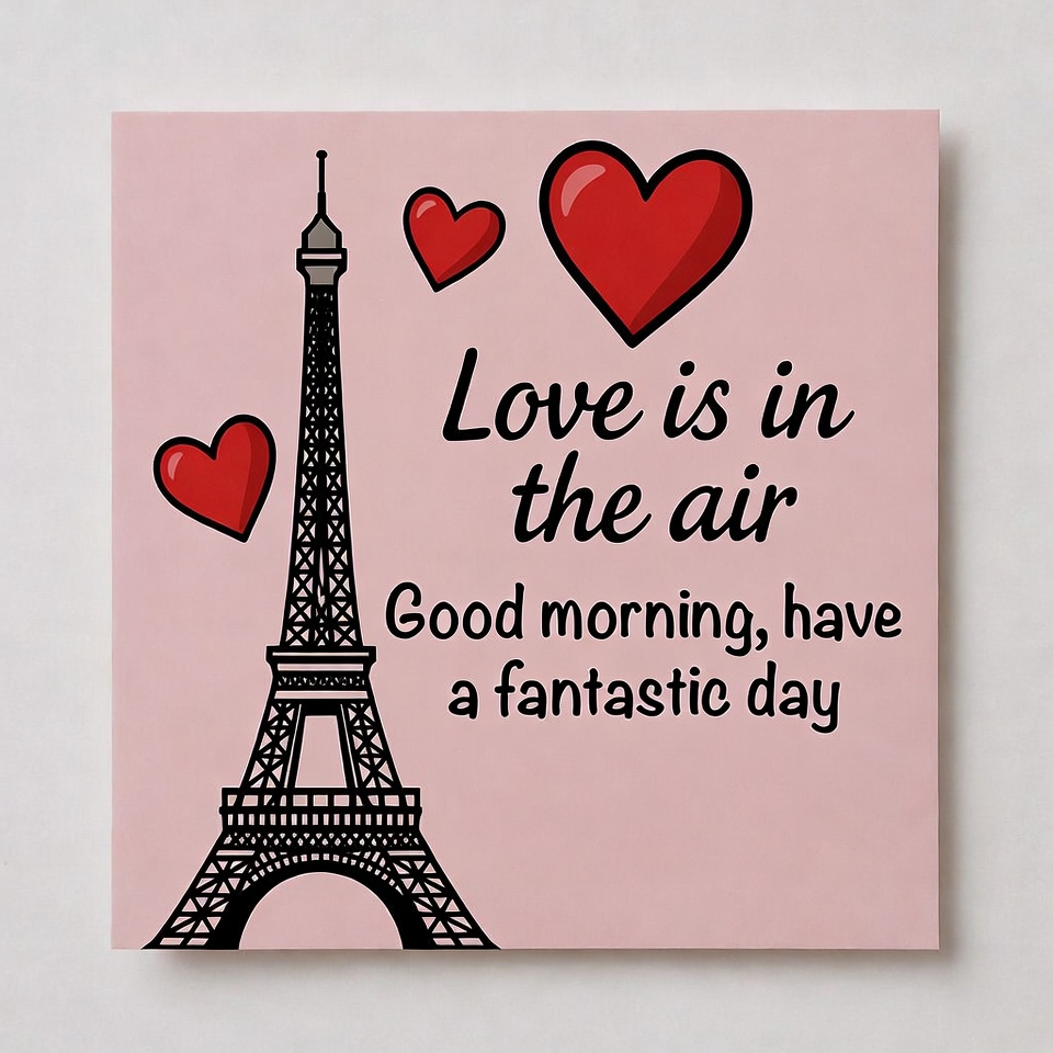 A pink square illustration features a black outline of the Eiffel Tower surrounded by red hearts. The text 'Love is in the air' and 'Good morning, have a fantastic day' is written in stylish font across the image. Multiple floating red hearts add a romantic touch on the isolated pink background.