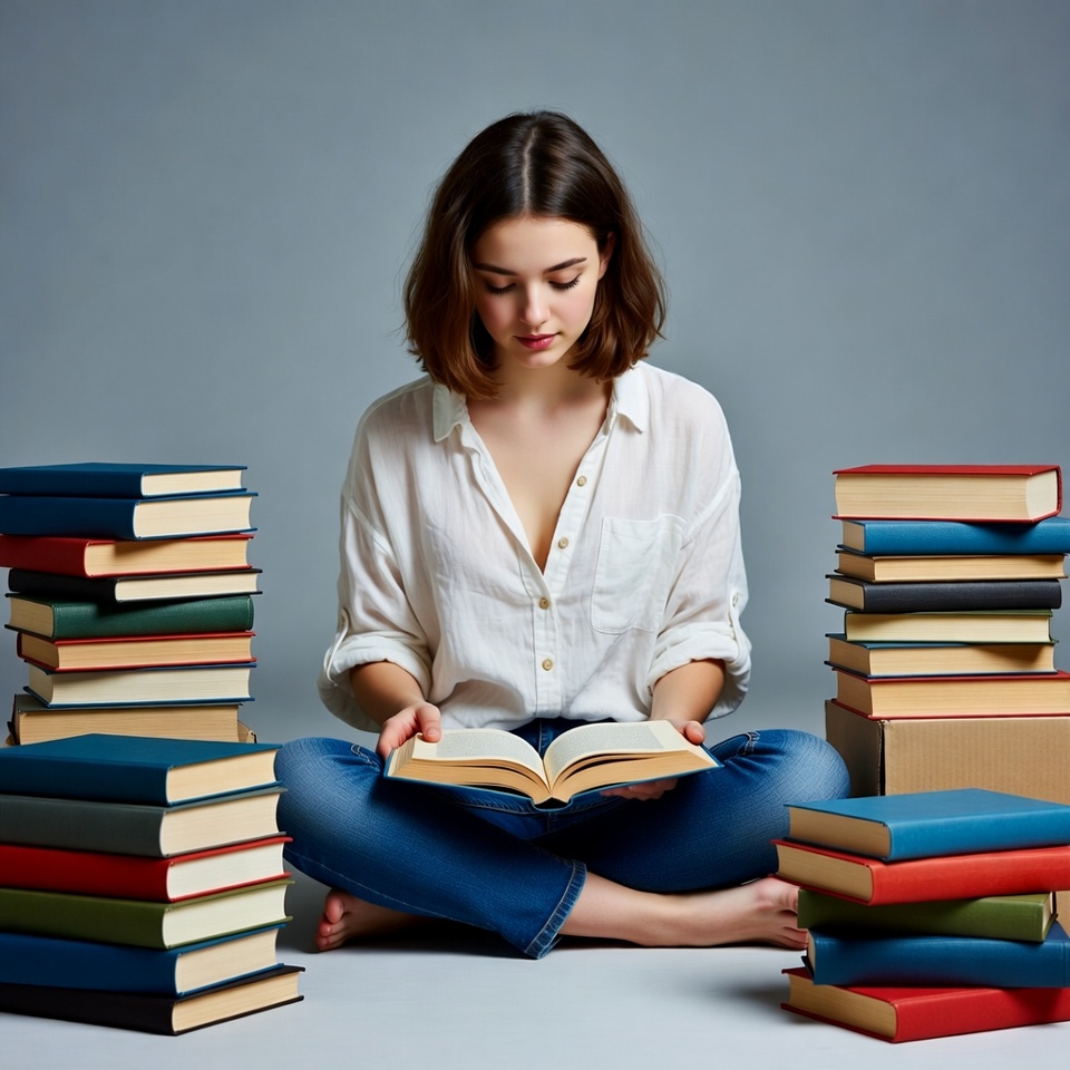 A young woman with shoulder-length brown hair sits cross-legged on the floor, intently reading an open book. She wears a white button-up shirt and blue jeans with bare feet. Tall stacks of colorful books in various sizes surround her on a plain gray background.