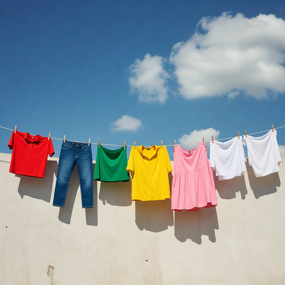 A row of colorful clothes hangs on a clothesline against a white wall under a bright blue sky with white clouds. The garments include a red t-shirt, blue jeans, green shirt, yellow shirt, pink dress, and white shirt. Shadows from the clothing fall on the wall below.