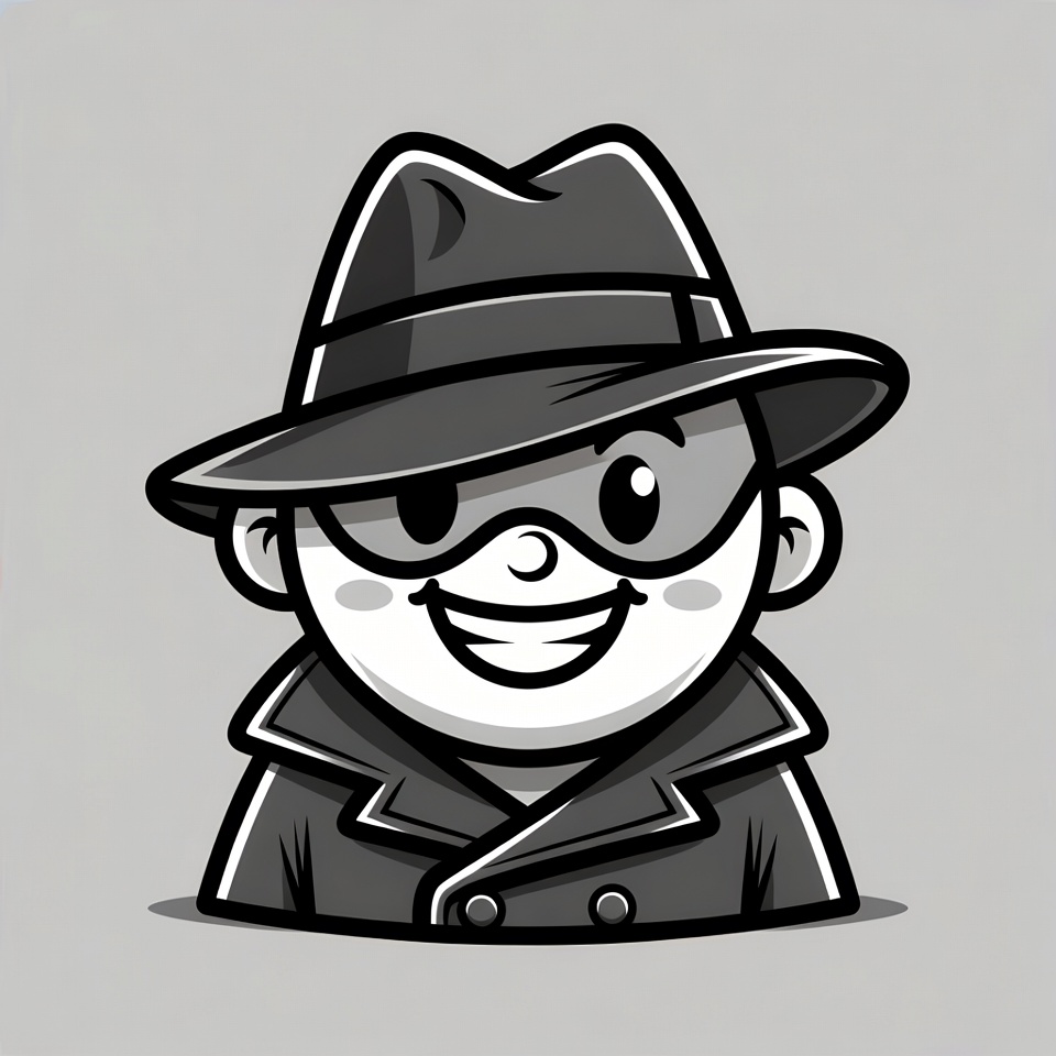 A chibi-style cartoon illustration depicts a smiling man dressed as a spy. He wears a wide-brimmed fedora hat, dark sunglasses, and a long trench coat with a turned-up collar. The black and white character stands against a light gray background.