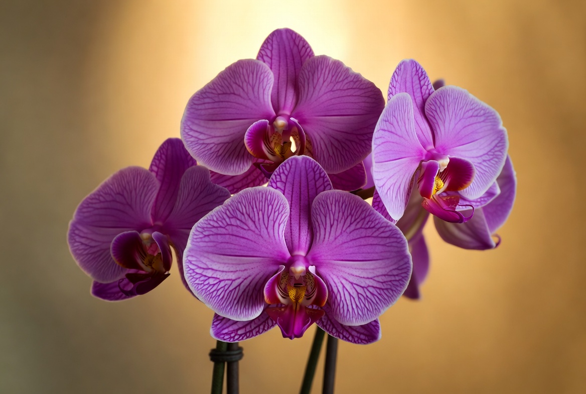 A cluster of vibrant purple orchids with detailed veined petals and yellow centers stands against a warm golden background. The flowers are grouped on slender green stems, showcasing their elegant blooms in close-up. Soft lighting highlights the rich magenta hues and intricate patterns of the orchid blossoms.