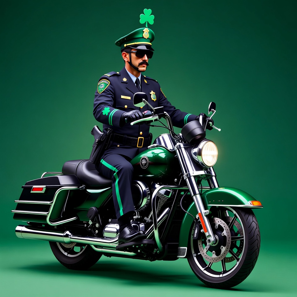 A man dressed in a green police uniform and shamrock hat rides a green motorcycle. He wears sunglasses and a mustache, posed confidently against a green background. The motorcycle features gold accents and a headlight.