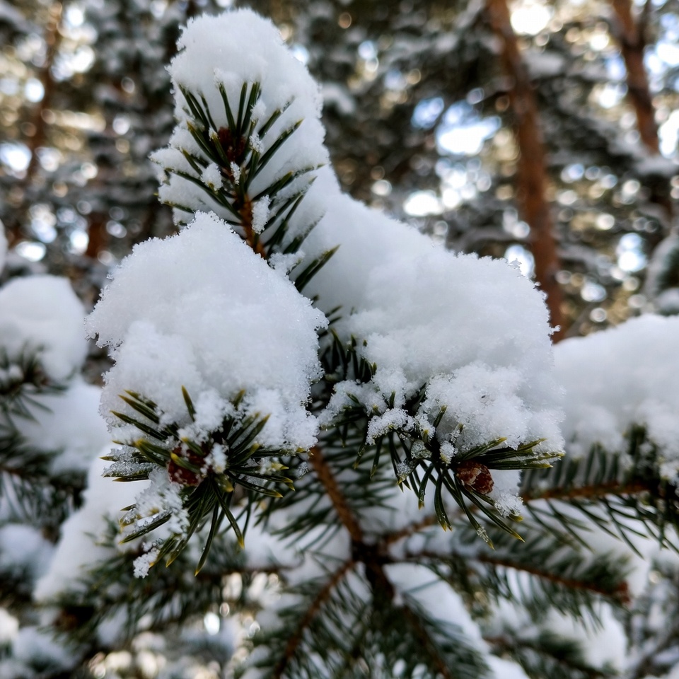 Snowy Pine Branches in Forest