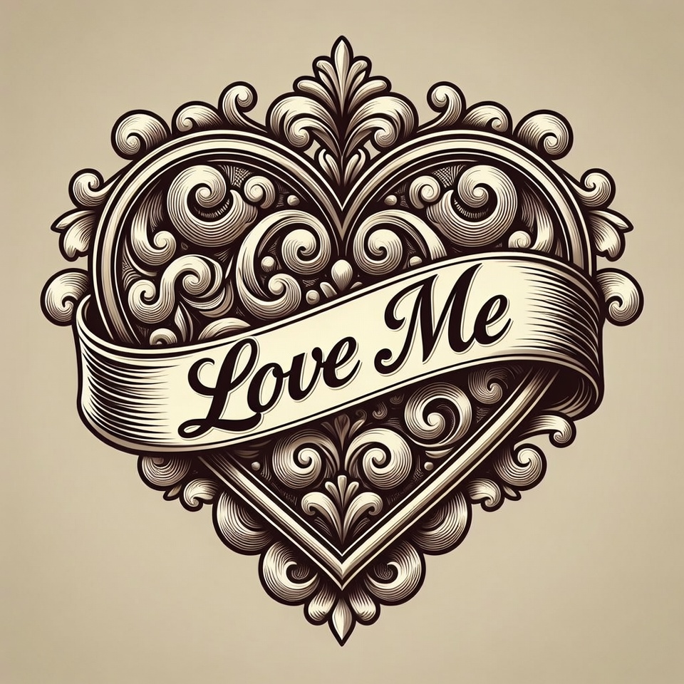baroque style, beige background, calligraphy, clipart, decorative heart, engraving, filigree, floral design, illustration, isolated background, line art, love me, ornate heart, ribbon banner, romantic, scrollwork, tattoo design, vector art, vintage heart, heart