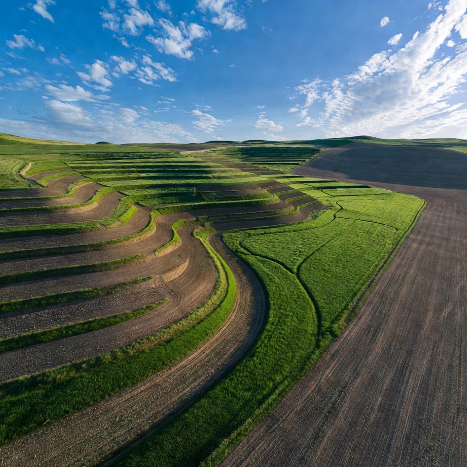 Aerial view of rolling hills with intricate terraced fields in vibrant green and earthy brown tones. Lush grass covers the curved terraces, contrasting with plowed soil patches. Fluffy clouds dot the bright blue sky above the expansive landscape.