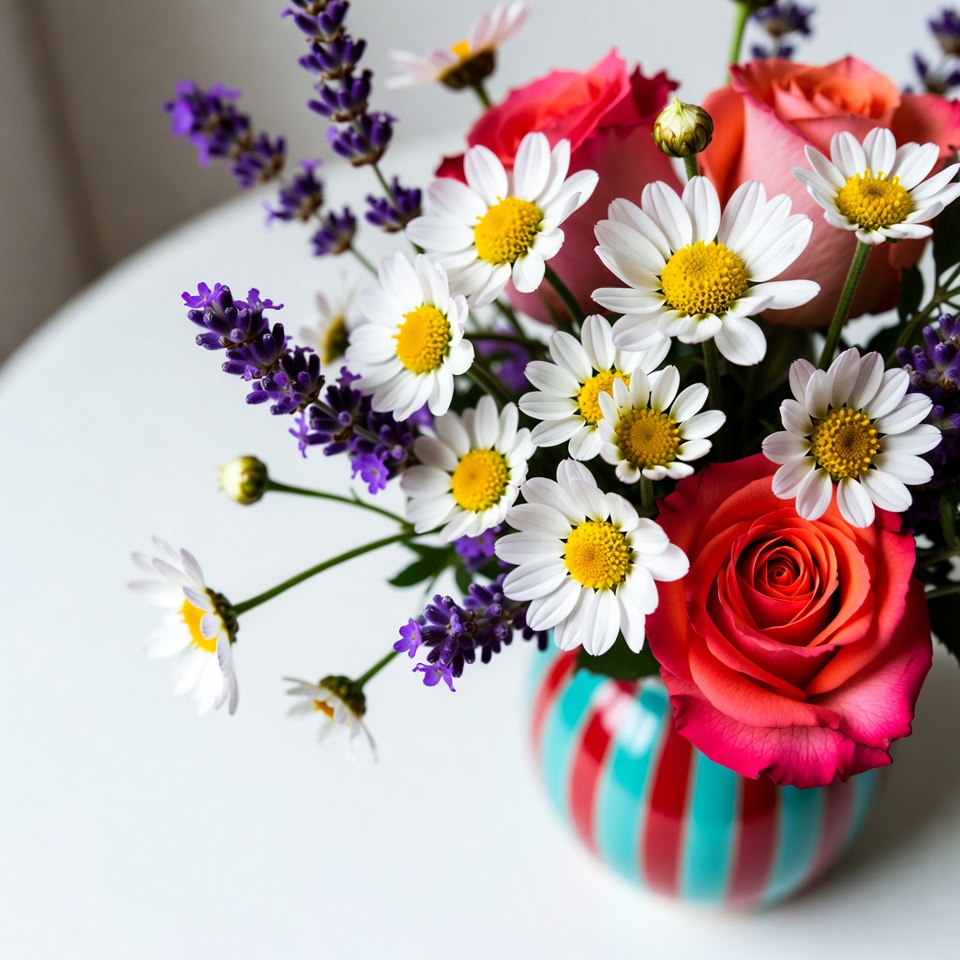 A vibrant bouquet of purple lavender, white daisies, and pink roses sits in a colorful striped vase on a white round table. The flowers are arranged loosely with stems visible and some greenery. The background is plain white, highlighting the vivid colors of the blooms.