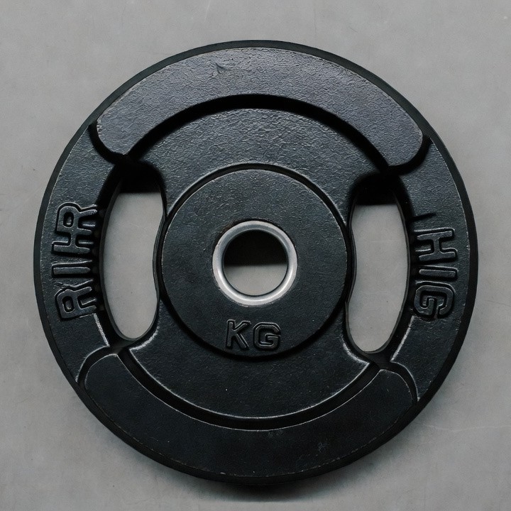 A black rubber-coated weight plate with a 20kg marking sits on a gray surface. It features a central hole with grips on the sides and 'RIR 20 KG' stamped on it. The plate has a textured surface for gym use.