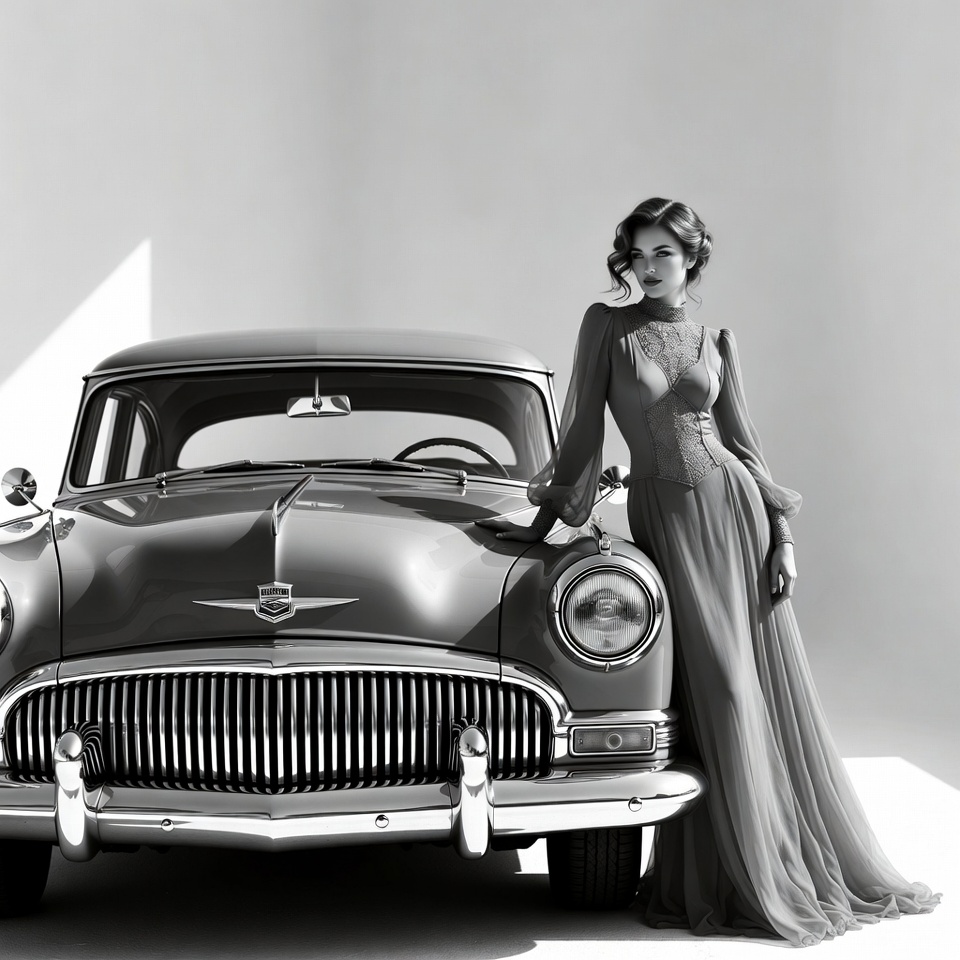 1940s fashion, White, black and white, classic car, elegant dress, female, lace dress, leaning pose, long dress, monochrome, retro style, studio background, vintage car, wavy hair, white background, woman