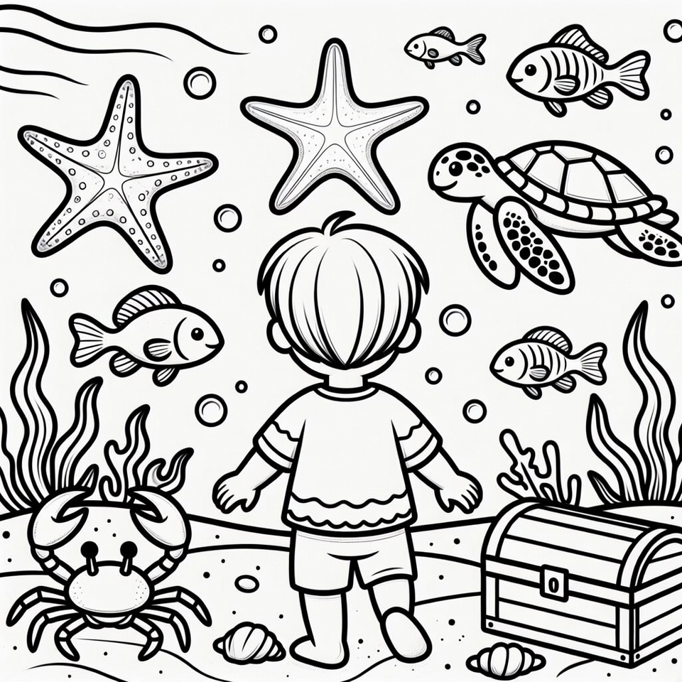 A line art coloring page illustration shows a young boy with short hair standing with his back turned, viewing an underwater scene. The scene features various sea animals including fish, starfish, a turtle, a crab, seaweed, bubbles, and a treasure chest on the ocean floor. The boy wears shorts and a shirt, with bare feet on the sandy bottom.