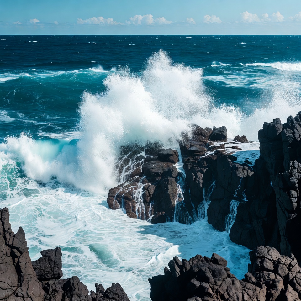 Powerful ocean waves crash dramatically against dark rugged rocks. White foam sprays high into the air amid turbulent blue waters. A clear sky stretches over the vast sea horizon.