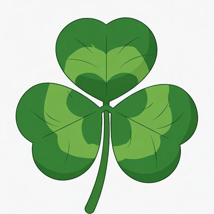 A vibrant green four-leaf clover illustration features smooth, rounded leaves with subtle lighter green shading on the veins. The clover stands alone on a white background with a short stem at the bottom. Each leaf has a heart-like shape, emphasizing its lucky symbol.