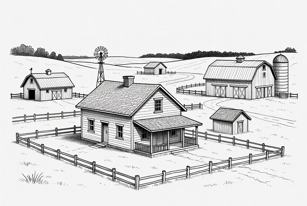 Black and white line drawing of a rural farm scene features a central house with a porch surrounded by a wooden fence. Nearby barns, silos, a windmill, and rolling hills are depicted in detailed ink outline style. The isolated background emphasizes the farm structures and landscape.