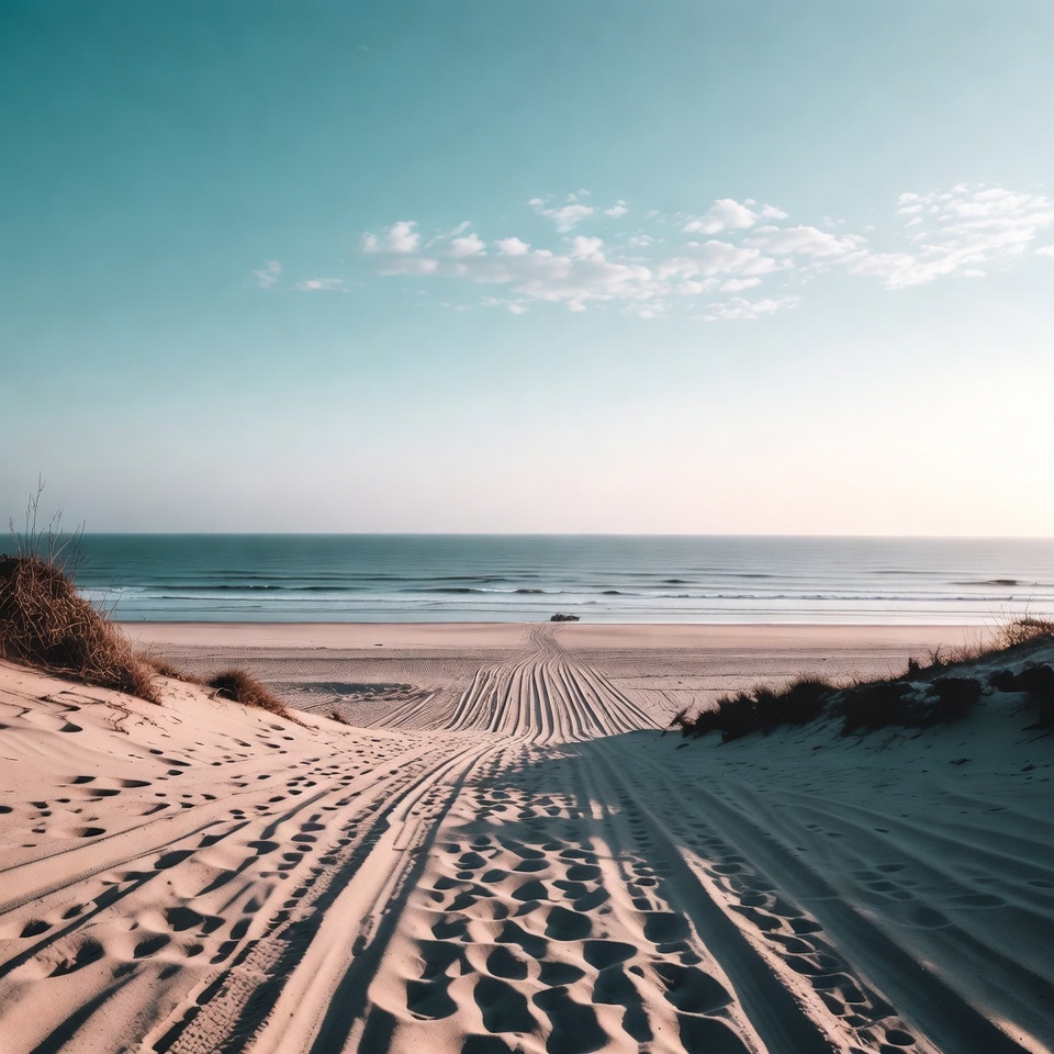 beach grass, blue sky, clouds, coast, dunes, footprints, isolated background, landscape, nature, ocean, path, sand, sandy path, sea, shoreline, sky, tire tracks, waves, beach