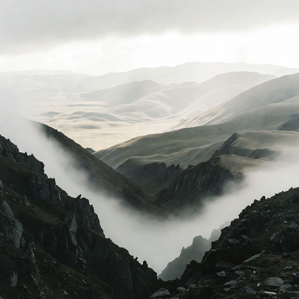Layered mountains stretch into the distance under a cloudy gray sky. Thick fog fills a deep valley between rugged rocky peaks. Green patches of grass dot the slopes amid the misty landscape.